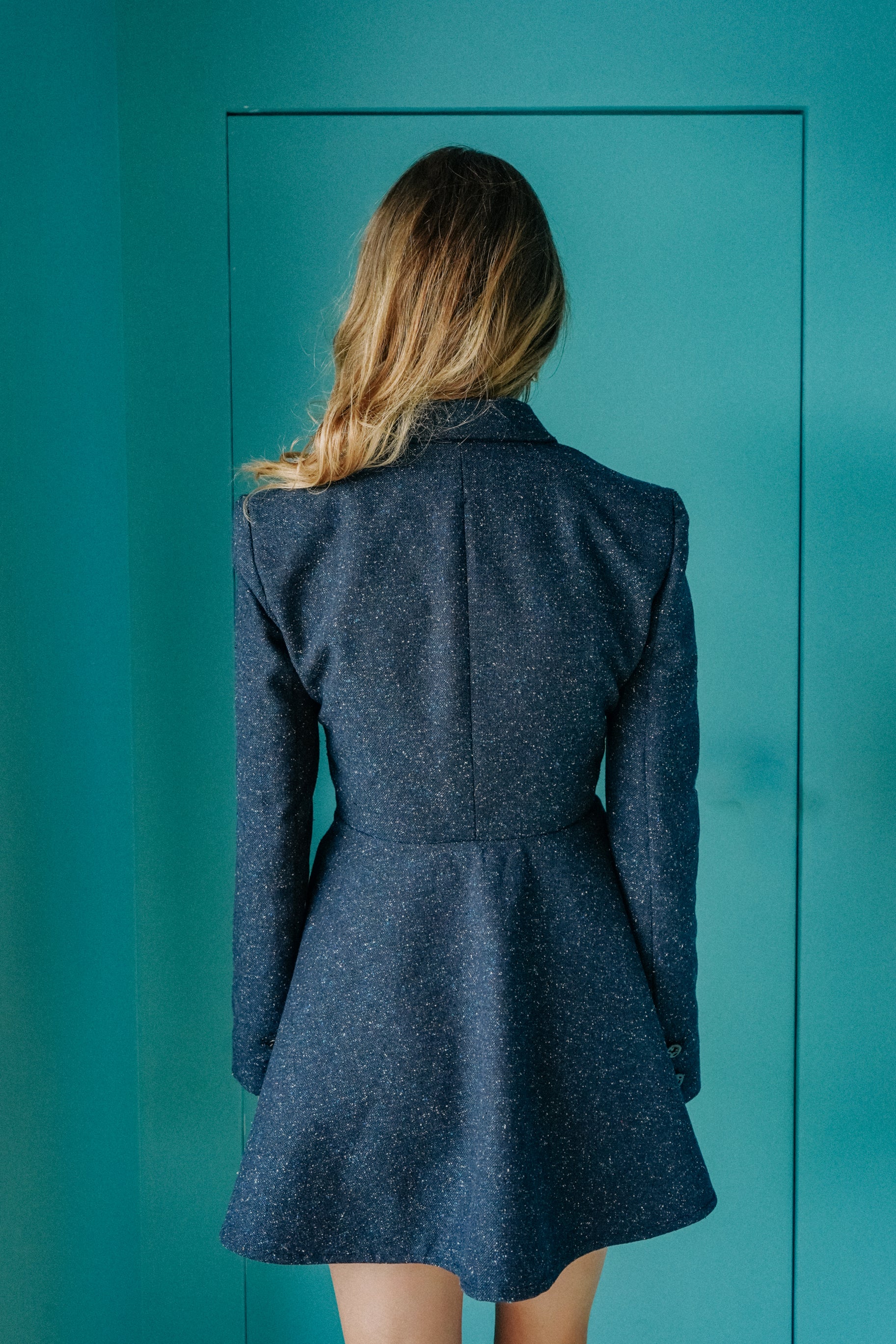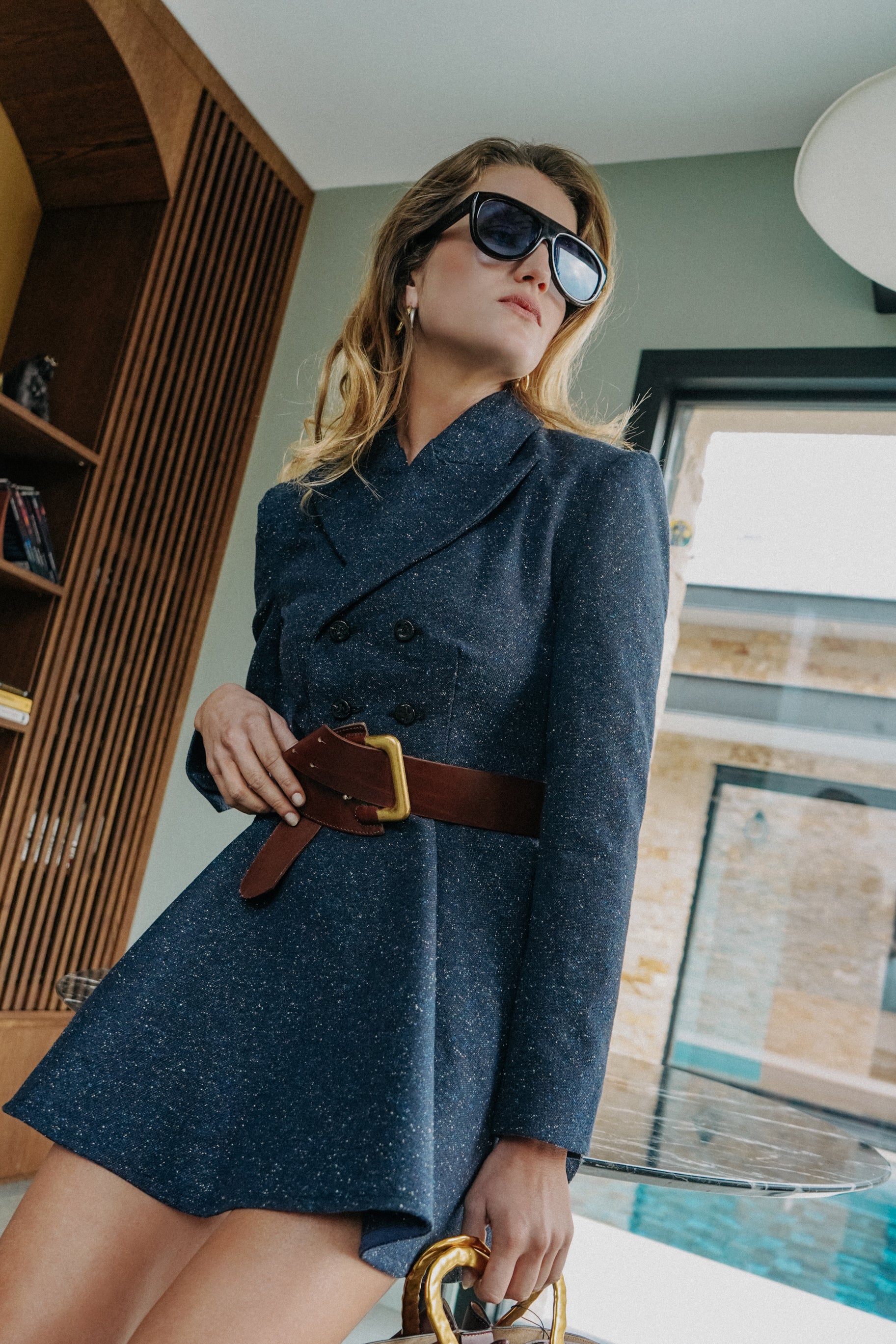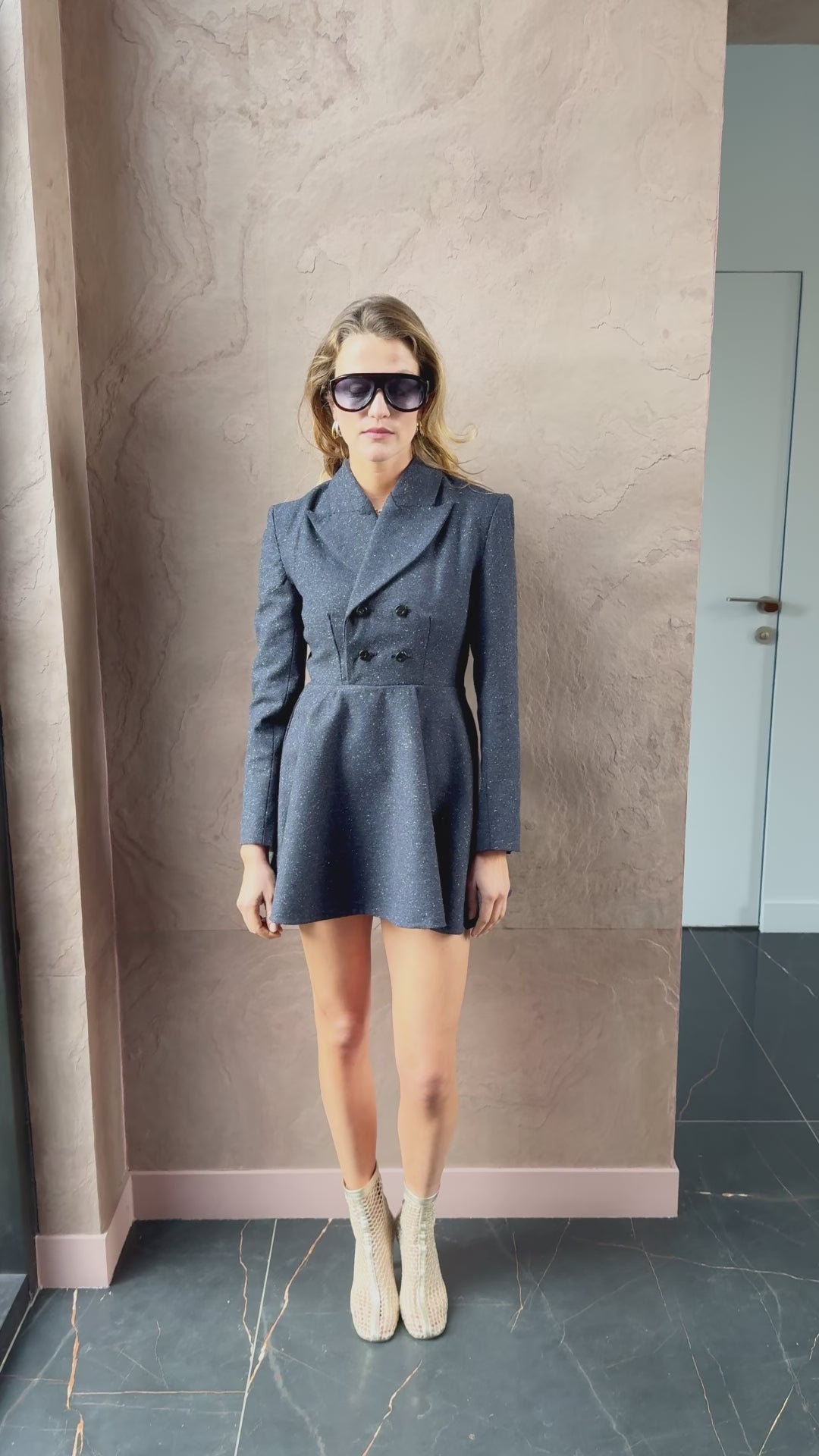 Wear this tailored dress as an elegant dress with discreet shorts or tights for added comfort, or leave it slightly open and pair it with pants to create a dynamic, modern look that transitions effortlessly from work to evening.